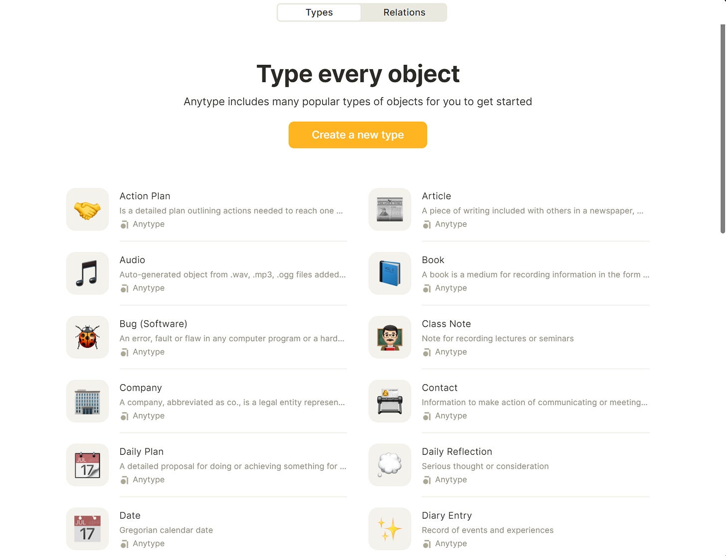 With Types in Anytype, you can either use the pre-installed ones, such as Action Plans, Articles and more.